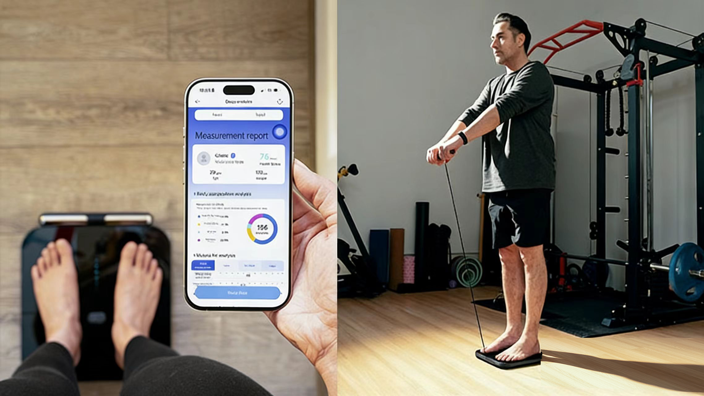 As you step on the scale and lift the retractable handle, subtle signals travel through your arms and torso — measuring upper-body data that standard scales miss.
